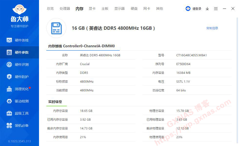 3、内存为单条16GB DDR5,频率是4800MHz;