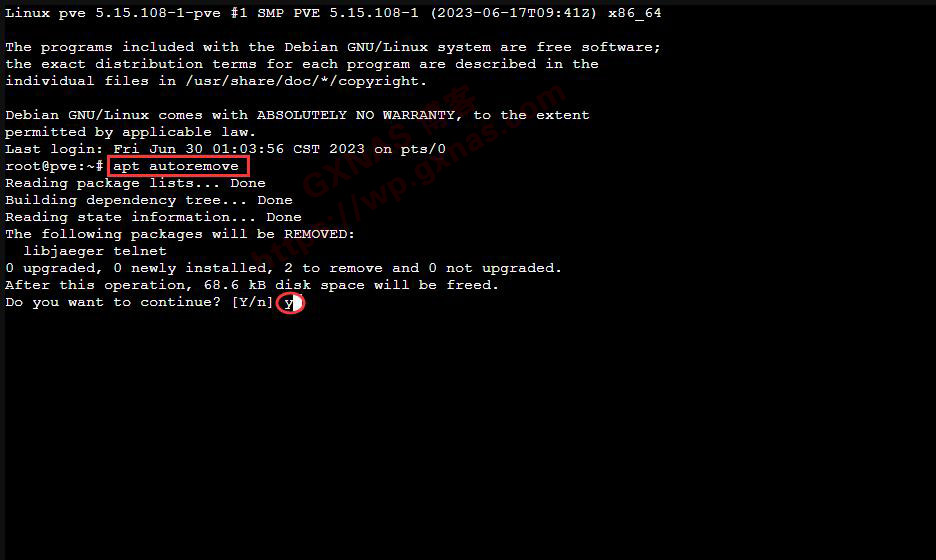 18、在Shell状态下输入apt autoremove回车,并输入y回车,自动清理本次升级更新产生的临时文件;