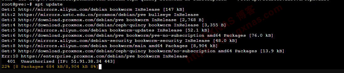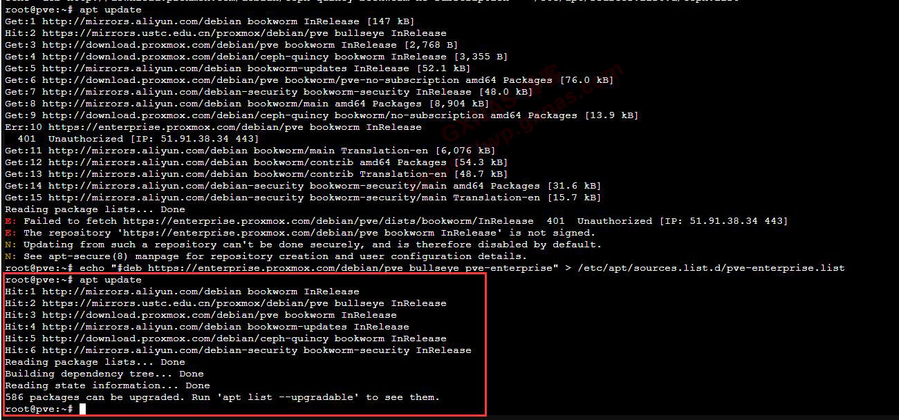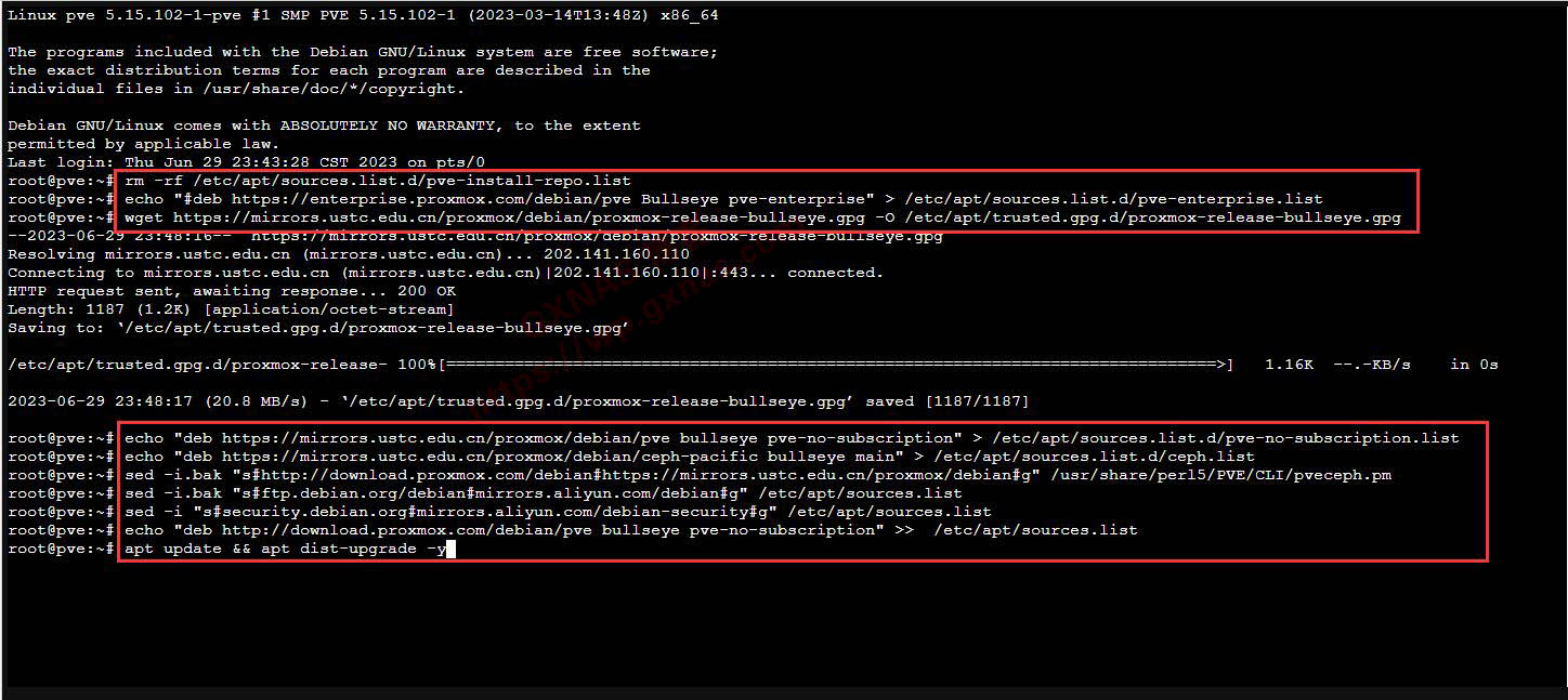 rm -rf /etc/apt/sources.list.d/pve-install-repo.listecho "deb https://enterprise.proxmox.com/debian/pve Bullseye pve-enterprise" > /etc/apt/sources.list.d/pve-enterprise.listwget https://mirrors.ustc.edu.cn/proxmox/debian/proxmox-release-bullseye.gpg -O /etc/apt/trusted.gpg.d/proxmox-release-bullseye.gpgecho "deb https://mirrors.ustc.edu.cn/proxmox/debian/pve bullseye pve-no-subscription" > /etc/apt/sources.list.d/pve-no-subscription.listecho "deb https://mirrors.ustc.edu.cn/proxmox/debian/ceph-pacific bullseye main" > /etc/apt/sources.list.d/ceph.listsed -i.bak "s#http://download.proxmox.com/debian#https://mirrors.ustc.edu.cn/proxmox/debian#g" /usr/share/perl5/PVE/CLI/pveceph.pm sed -i.bak "s#ftp.debian.org/debian#mirrors.aliyun.com/debian#g" /etc/apt/sources.listsed -i "s#security.debian.org#mirrors.aliyun.com/debian-security#g" /etc/apt/sources.listecho "deb http://download.proxmox.com/debian/pve bullseye pve-no-subscription" >> /etc/apt/sources.listapt update && apt dist-upgrade -y