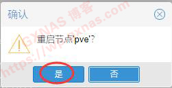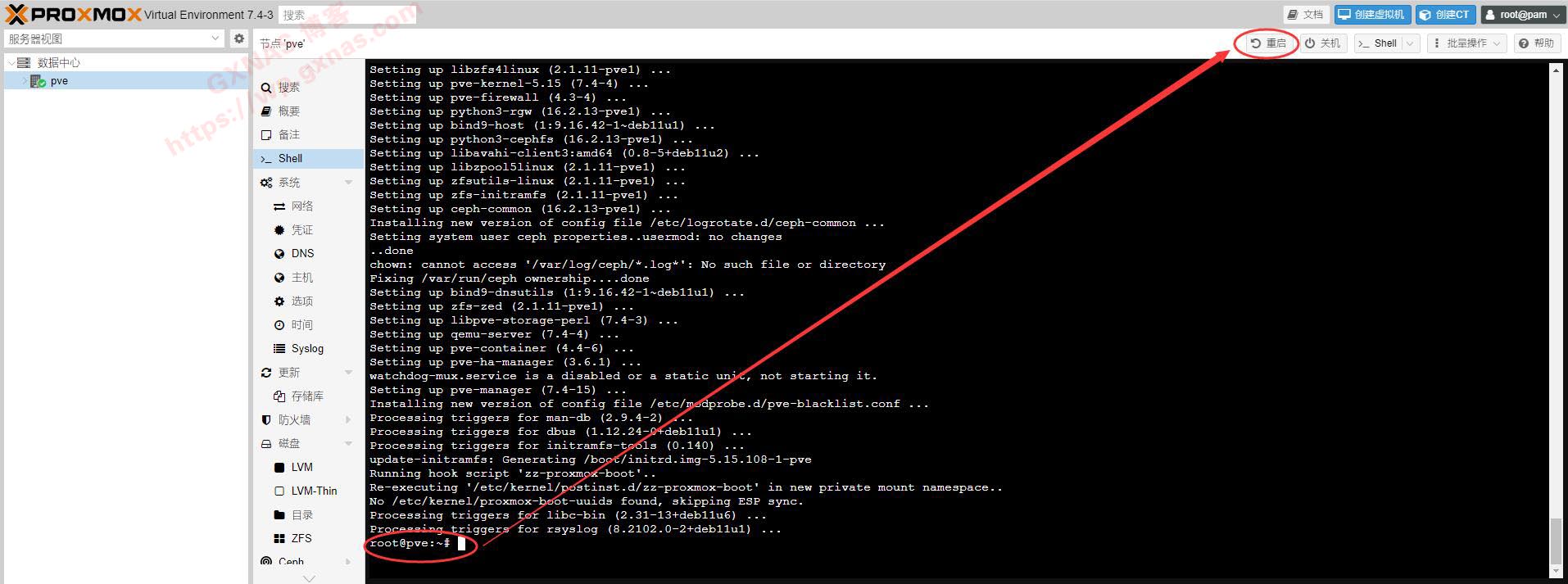 4、当命令全部运行结束后,会回到“root@pve:~#”这样的命令行状态,点PVE菜单上的重启键,重启一次;)