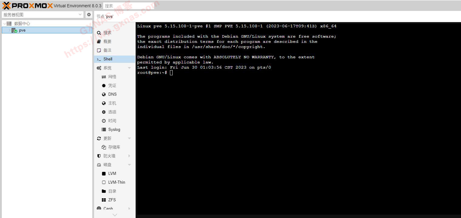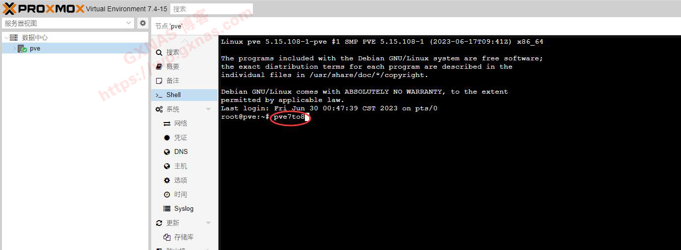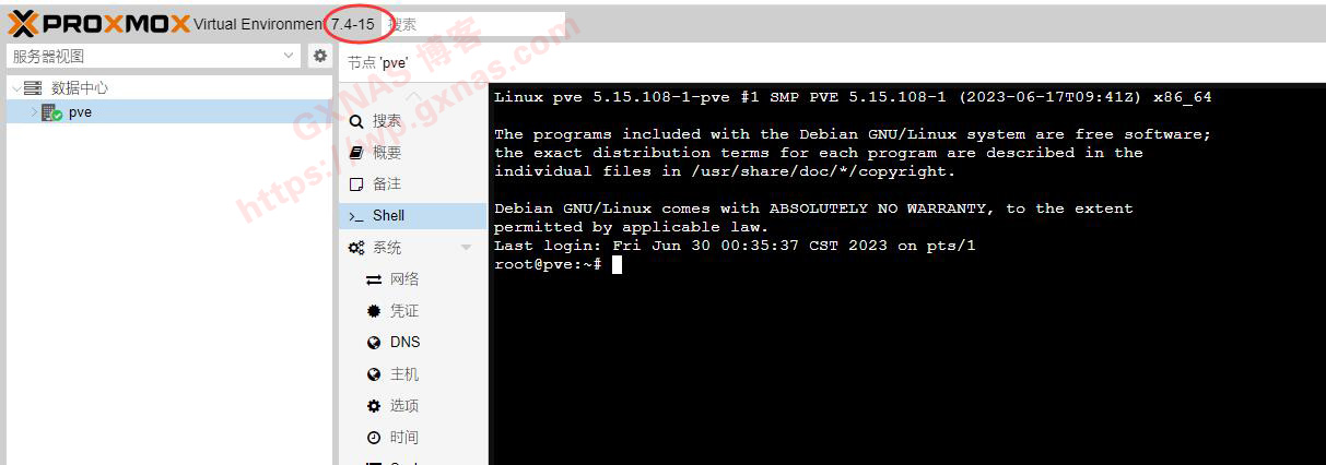 1、博主这台PVE的系统是7.4-3,点PVE左边菜单,找到Shell的菜单,点击进入到命令行的状态;)