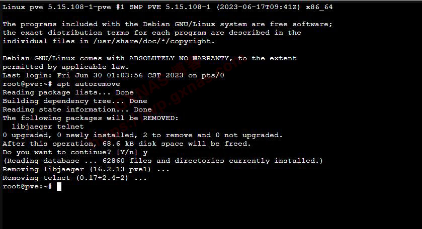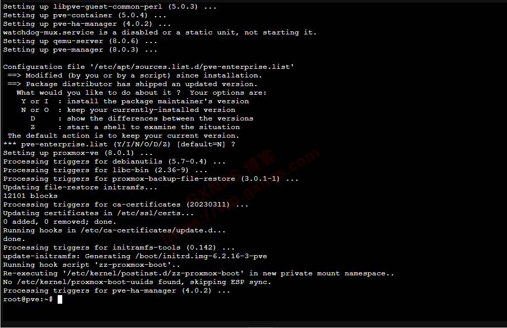 16、当命令全部运行结束后,会回到“root@pve:~#”这样的命令行状态,这样就更新成功了;)