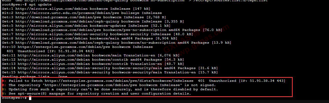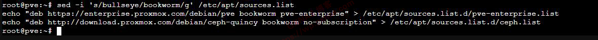 sed -i 's/bullseye/bookworm/g' /etc/apt/sources.listecho "deb https://enterprise.proxmox.com/debian/pve bookworm pve-enterprise" > /etc/apt/sources.list.d/pve-enterprise.listecho "deb http://download.proxmox.com/debian/ceph-quincy bookworm no-subscription" > /etc/apt/sources.list.d/ceph.list