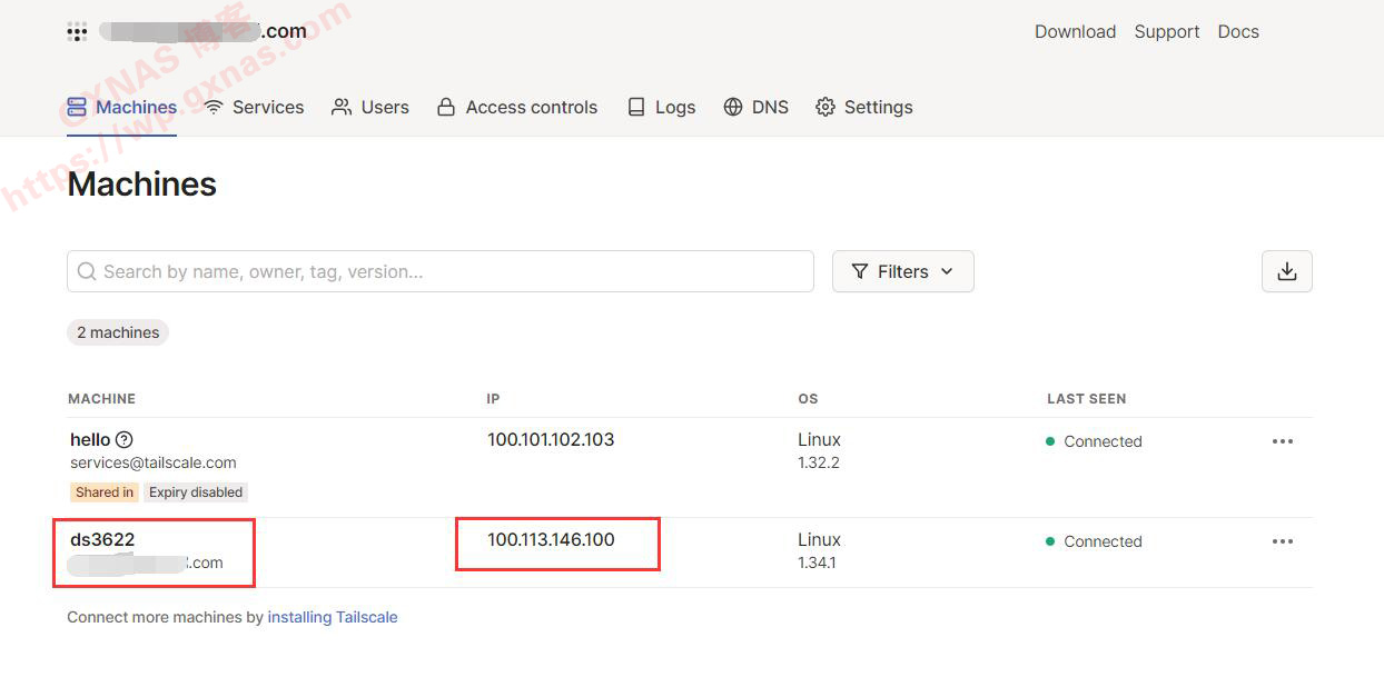 10、登录到主界面就可以看到群晖NAS的名称显示在上面,并且获取到一个虚拟网的IP地址(我这台群晖获取到的IP地址是100.113.146.100);
