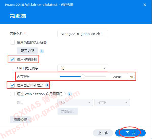 8、在“启用自动重新启动”处打勾,然后据说这货比较吃硬件资源,所以我做了一下限制,下一步;