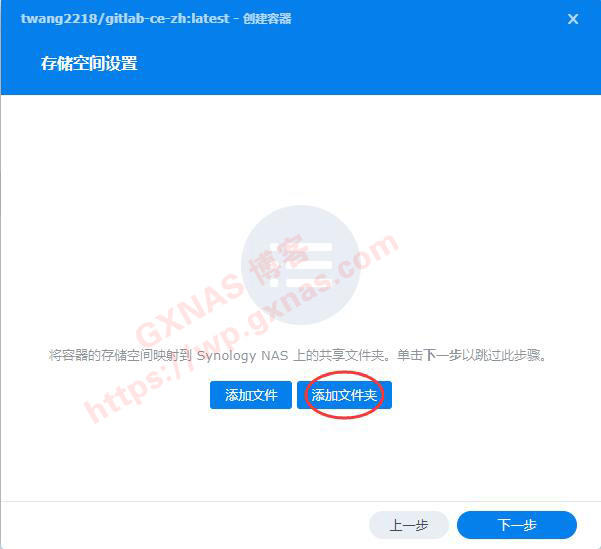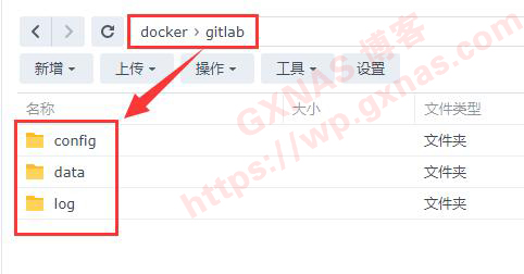 2、通过File Station在docker文件夹下面建立gitlab文件夹,进入gitlab文件夹再建立三个子文件夹,文件夹的名称分别为config、data、log;