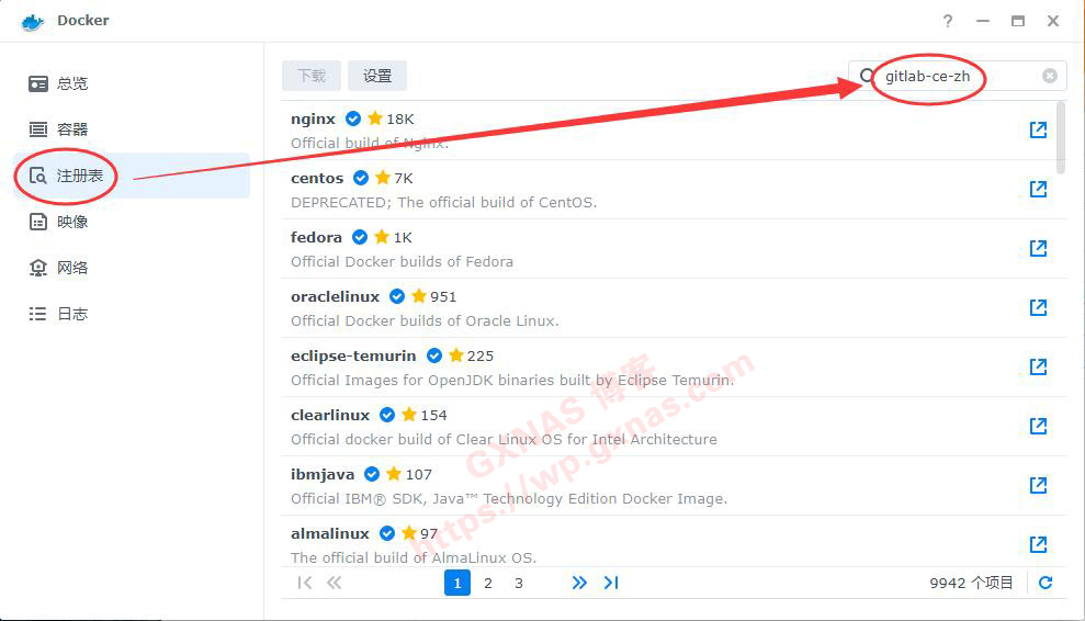 3、打开docker套件,在注册表输入gitlab-ce-zh回车;