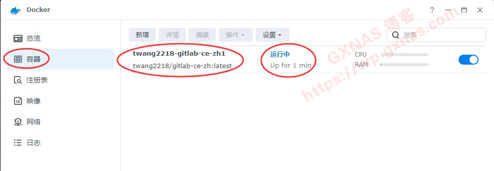 13、在Docker左边菜单,容器,看到twang2218/gitlab-ce-zh显示已经在运行中;