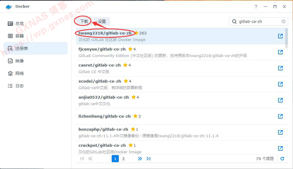 4、在搜索出来的列表选择第一个“twang2218/gitlab-ce-zh”,下载;