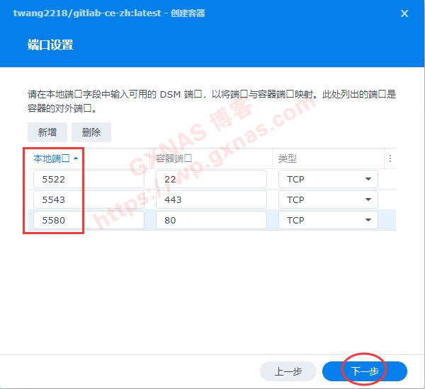 9、映射三个端口(从上到下分别为Gitlab的SSH端口、Gitlab的Http端口、Gitlab的Https端口),本地端口选择群晖没有被占用的端口,下一步;