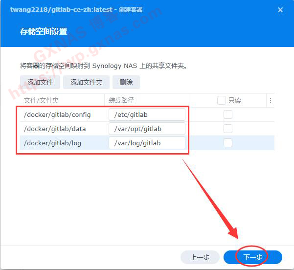 11、把第2个步骤建立的三个子文件夹映射进来,装载路径分别是:/etc/gitlab、/var/opt/gitlab、/var/log/gitlab,下一步;