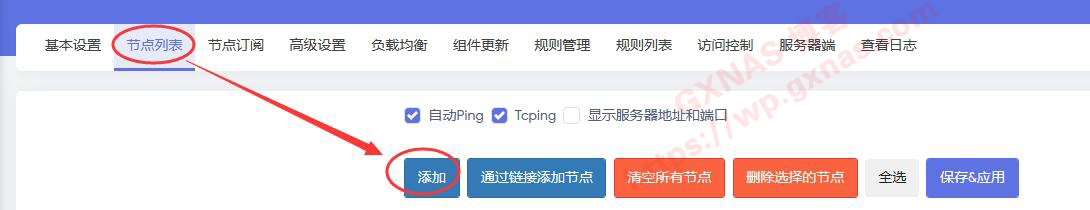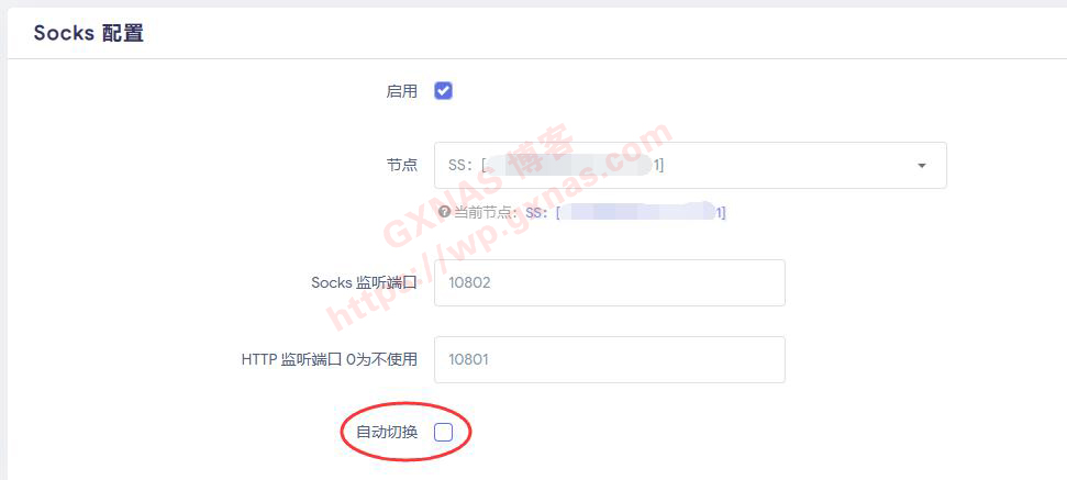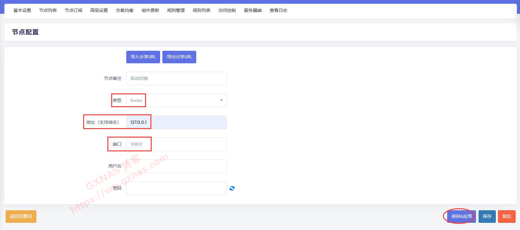 6、节点名称自己写一下(我写的是:自动切换),类型为“Socks”,地址写“127.0.0.1”,端口写第1个步骤设置的“Socks监听端口”,点“保存&应用”;