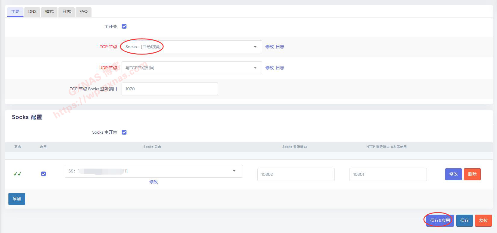 9、如果将来需要改变主用节点的话,只需要在“Socks配置”那里把“Socks节点”选择好,点“保存&应用”就可以了。