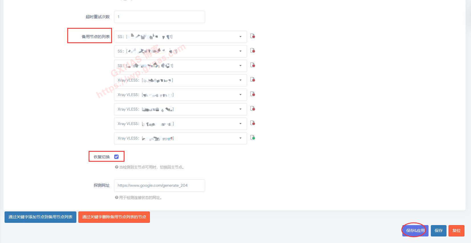 4、在备用节点的列表中,根据自己实际情况,选择备用节点,在“恢复切换”处打勾,设置完成点“保存&应用”;