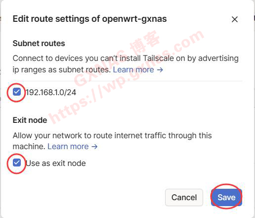 16、在“192.168.1.0/24”(第8个步骤命令中你写的网段是什么,这里就显示什么)和“Use as exit node”这两处打勾,再点“Save”;)