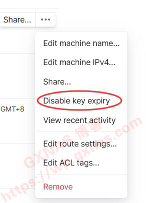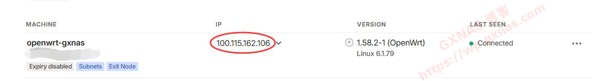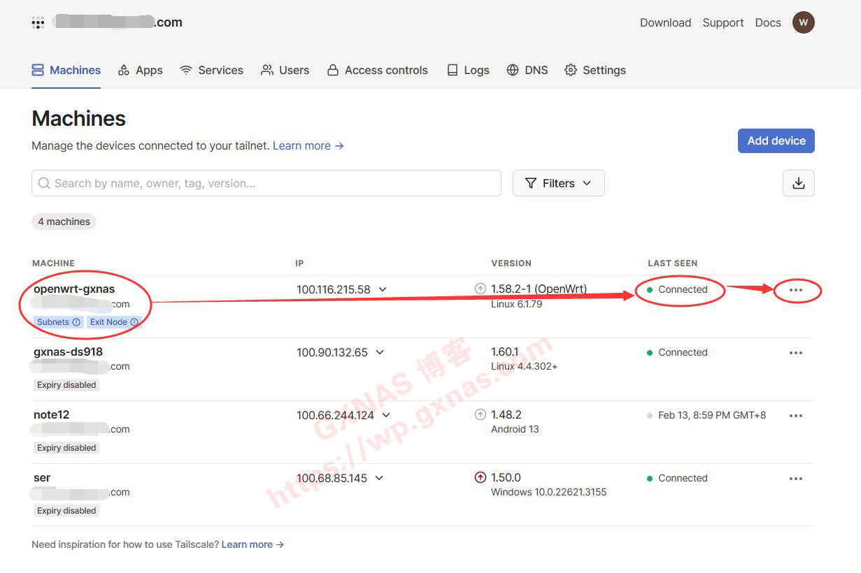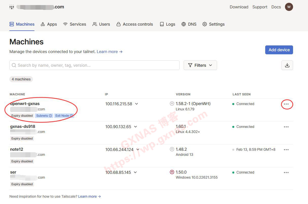 12、在tailscale的管理后台,可以看到当前组网的设备清单(博主有NAS、台式电脑、OpenWrt旁路由、手机一共4台设备一起组网),其中名称为“openwrt-gxnas”的就是刚刚添加进入的Openwrt软路由,有个绿灯并显示Connected就表示该设备正常联网了,点右边三个小点;)
