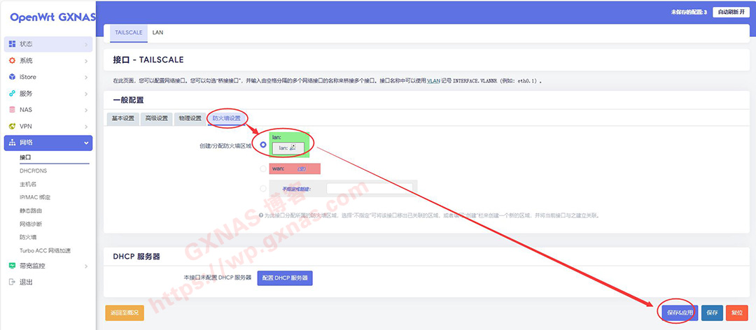 5、点击“防火墙设置”,创建/分配防火墙区域选择“LAN”,点“保存/应用”;)