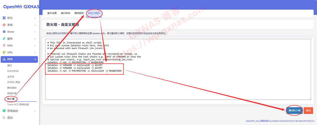 6、把以下三行内容复制,到“防火墙”、“自定义规则”处粘贴,再点一下“重启防火墙”;