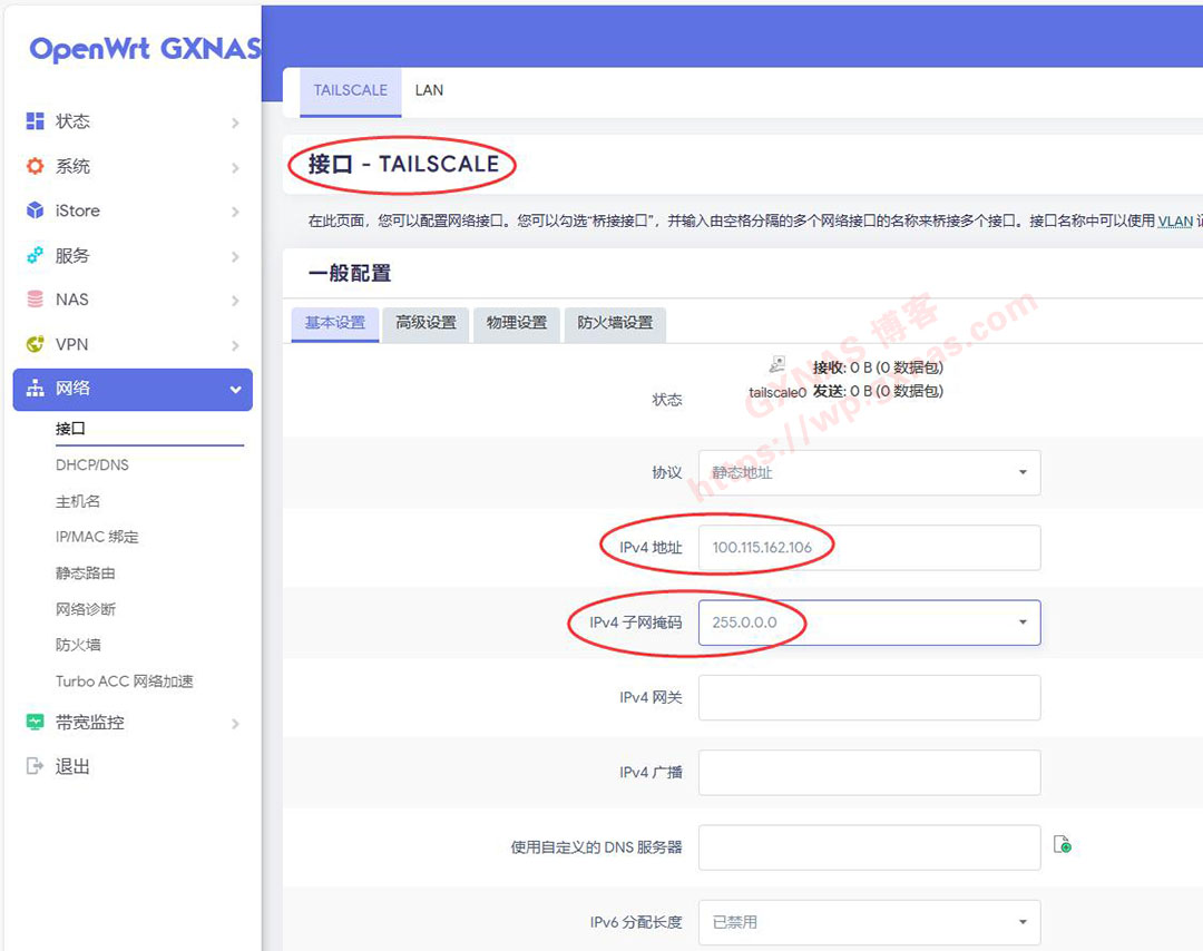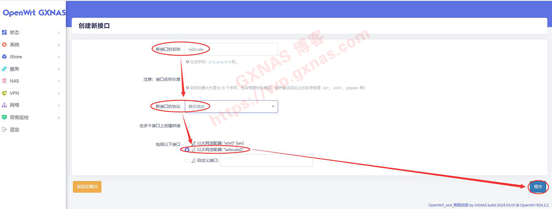 2、新接口的名称我写的是tailscale,新接口的协议选择“静态地址”,在“包括以下接口”处选择“以太网适配器:tailscale0”,提交;)