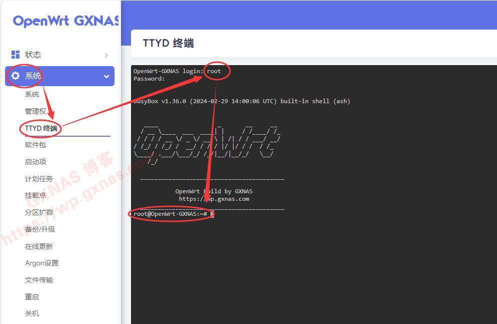 6、点OpenWrt左边菜单,系统,TTYD终端,输入超级管理员账号root以及密码,进入root状态下(如果你使用的OpenWrt固件不带TTYD终端,也可以在电脑上使用MobaXterm、Xshell、Putty之类的软件登录到OpenWrt的root状态下);)