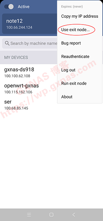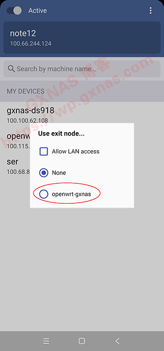 2、在弹出的小窗口选择在“【内网穿透的设置步骤】”第16步骤中设置的exit node出口设备名称(我这里的设备是“openwrt-gxnas”);)