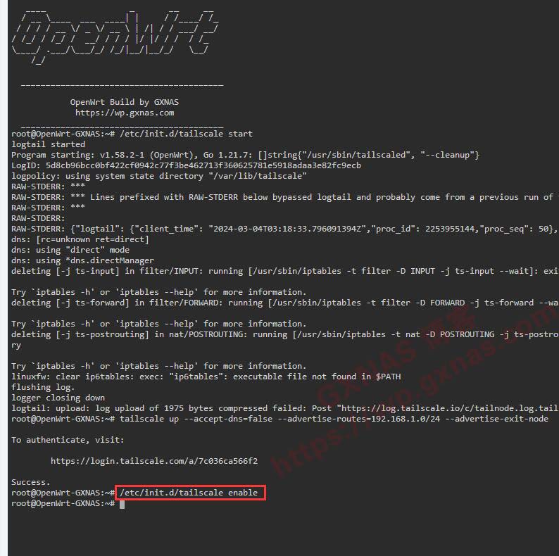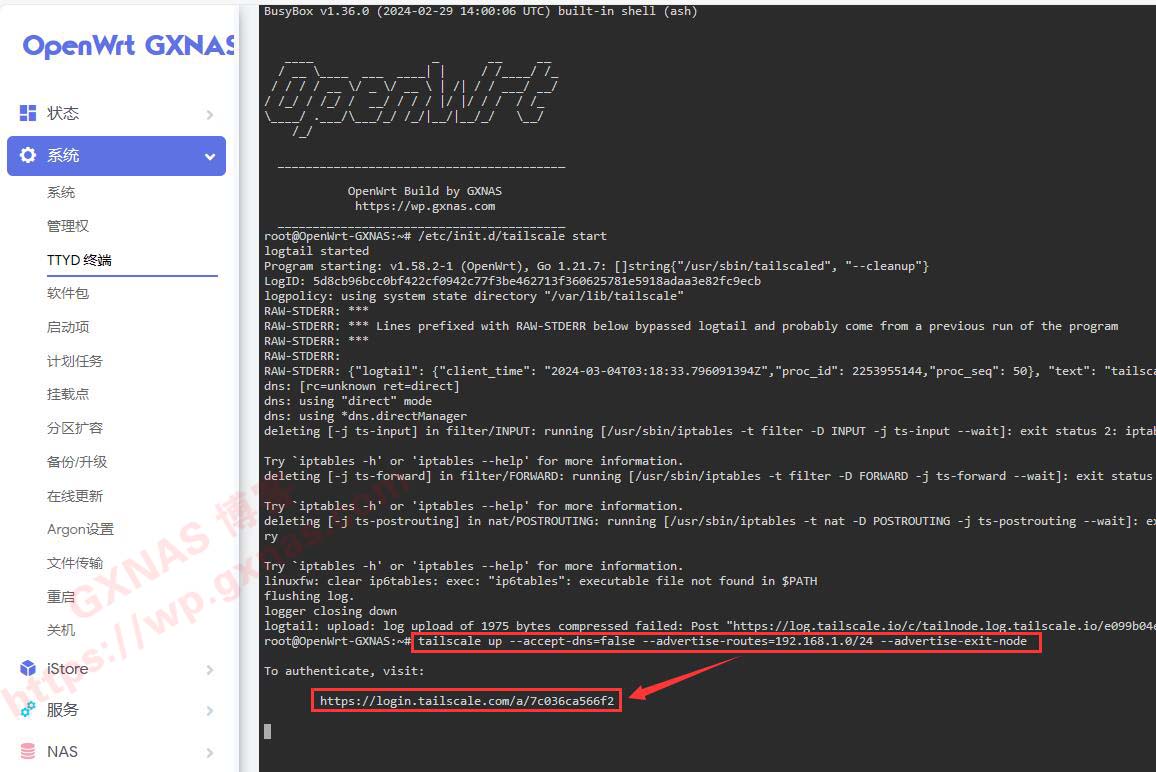 8、输入以下命令回车,设置本设备为局域网出口,如果你的局域网不是192.168.1.X的网段,需要将命令中的192.168.1.0修改你的局域网实际的网段(假设你的openwrt的IP是10.10.10.222,那么命令应该写tailscale up --accept-dns=false --advertise-routes=10.10.10.0/24 --advertise-exit-node,注意命令行中有空格),运行后会弹出一个链接让我们登录,点击该链接: