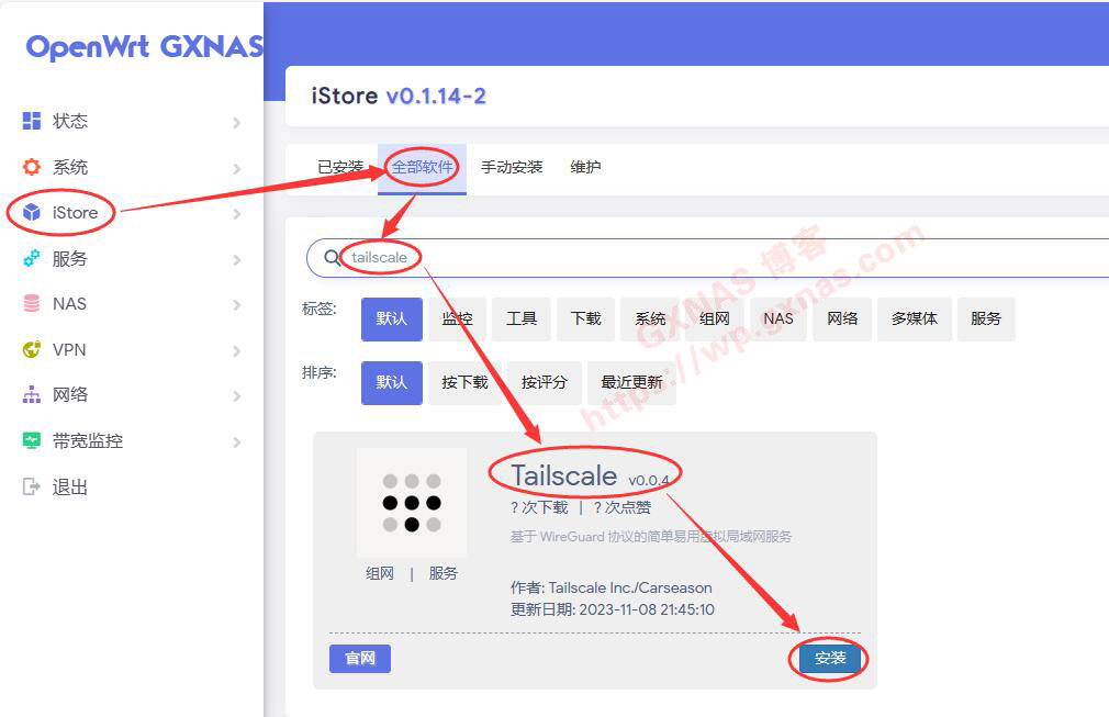 2、在OpenWrt左边菜单,iStore,全部软件,搜索栏输入tailscale回车,在下图位置显示的tailscale,点“安装”;)