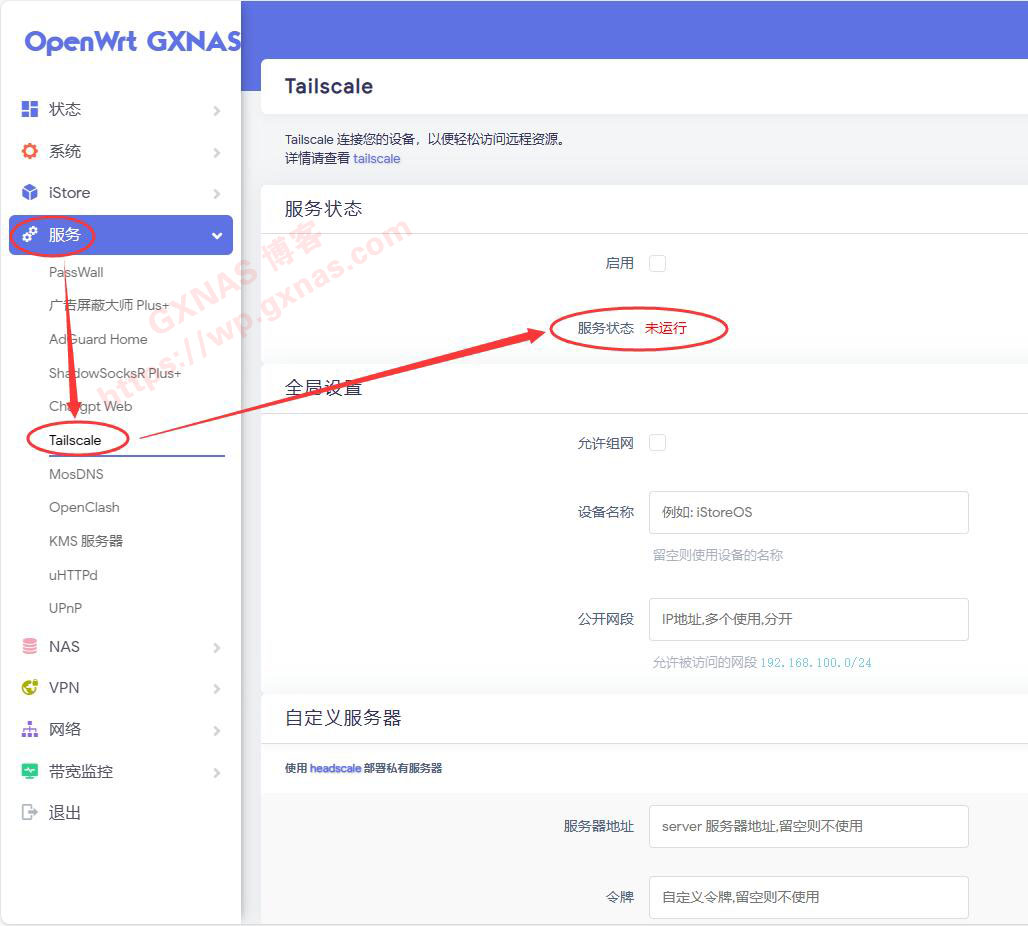 5、点OpenWrt左边菜单,服务,Tailscale,右边显示的服务状态为“未运行”,由于直接在图形界面不好设置,所以需要到命令行去设置;)