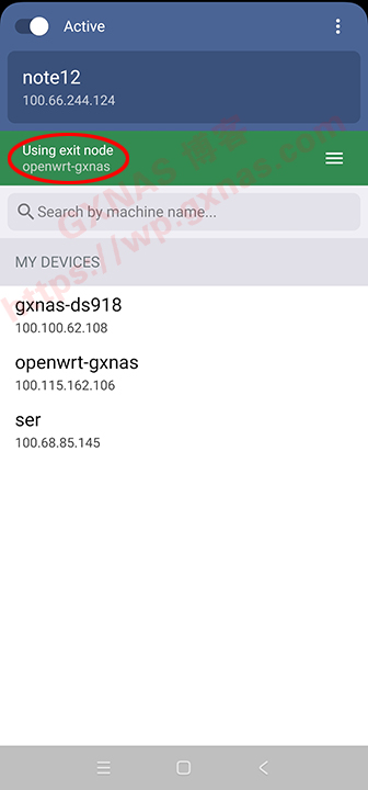 3、tailscale手机app会多出一行绿色的状态栏,显示exit node出口设备和名称;)