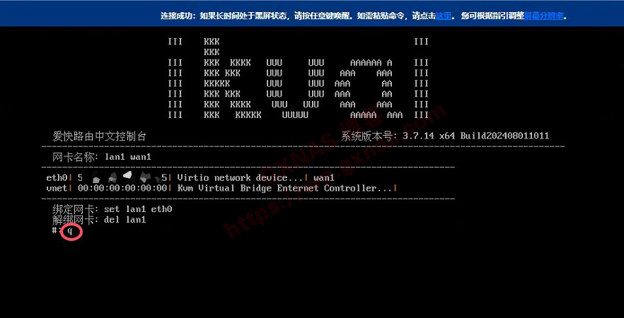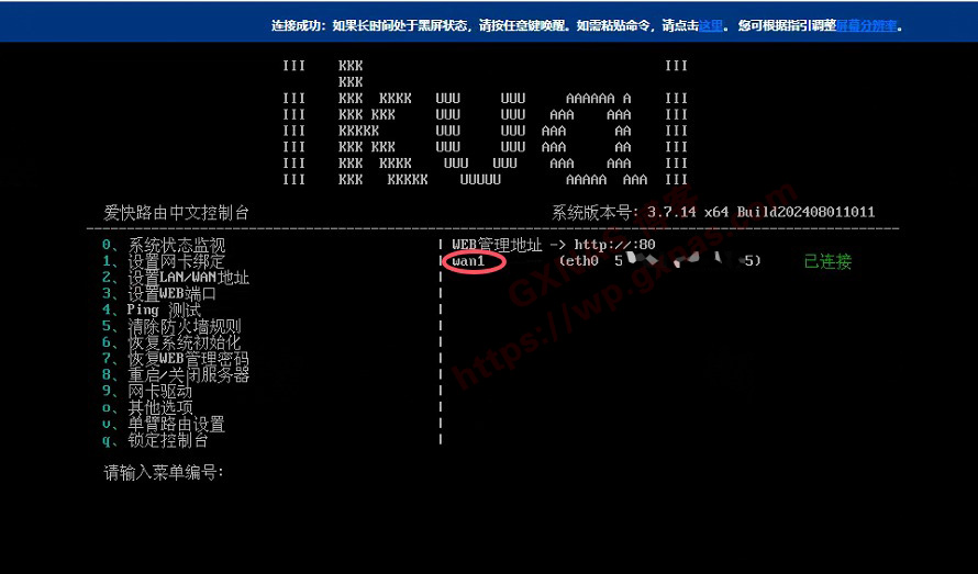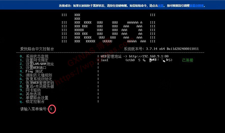 10、当看到如下图右边显示有web管理地址出来并且lan1显示“已连接”的时候,就表示爱快软路由系统已经启动好了,输入1 回车;)