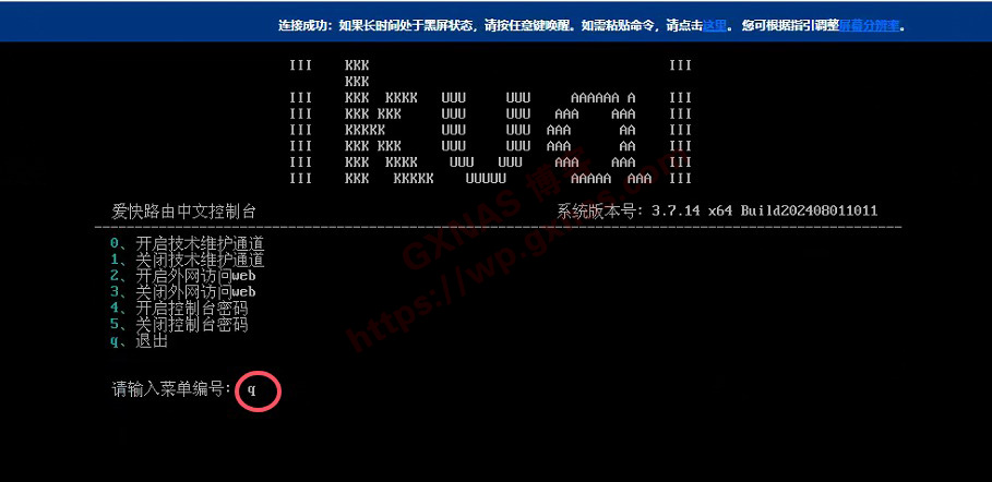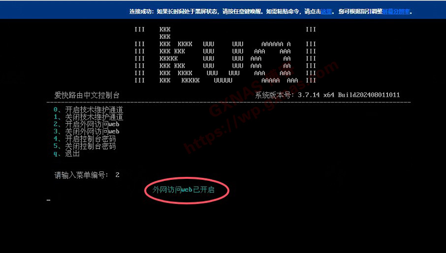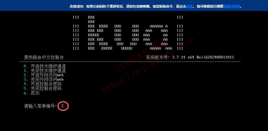 16、输入2 回车,开启爱快软路由系统的远程web访问功能;)