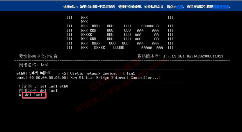 11、输入 del lan1 回车,删除默认的lan1口网卡绑定;)