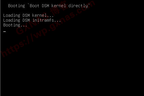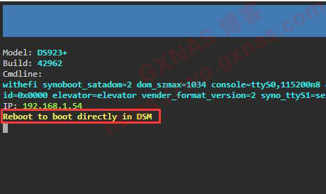 15、当NAS物理主机屏幕(或者是NAS虚拟机的屏幕)显示“Reboot to boot directly in DSM”的时候,表示系统即将重启,请耐心等待启动完成;