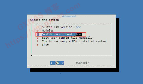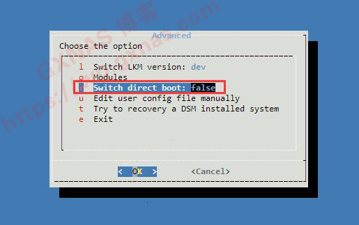 11、移动方向键到“Switch direct boot:false”处,回车;