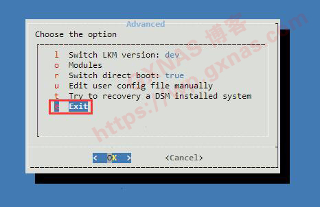 4、按向下的方向键,移动到“Try to recovery a DSM installed system”处,回车;