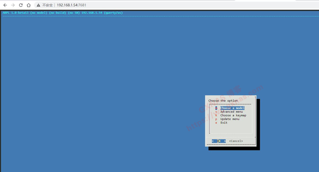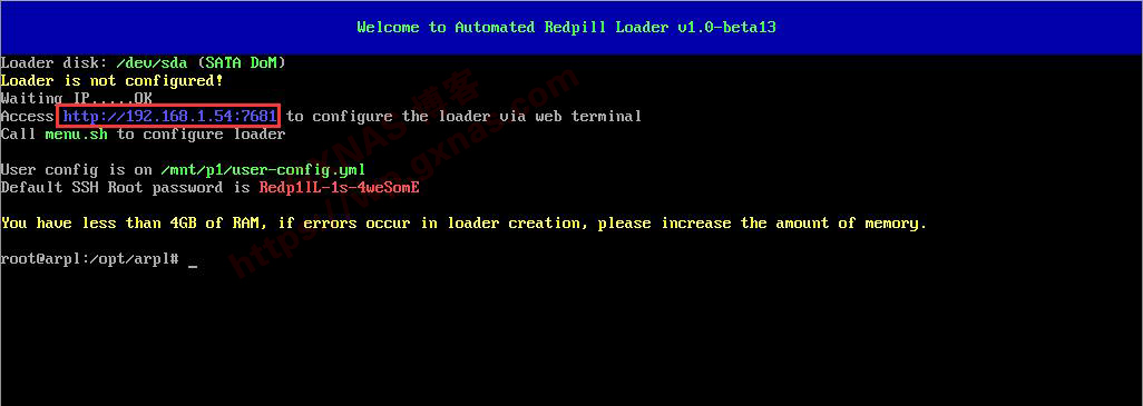1、把带有DSM7系统的硬盘装到做NAS的电脑主机上,在另外的电脑下载ARPL最新版本的IMG,做成引导盘启动(如果你还不知道怎样做,那么建议先去学习一下《史上最简单的黑群晖DSM7.X引导编译方法,小学生都能操作!》这篇教程),启动完成后屏幕上会显示一个IP地址,记下来;