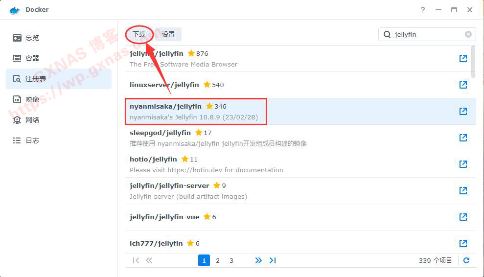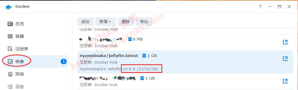 10、在Docker的“映像”菜单,找到刚刚下载完成的Jellyfin容器,确认一下是最新的版本10.8.9,没有问题;