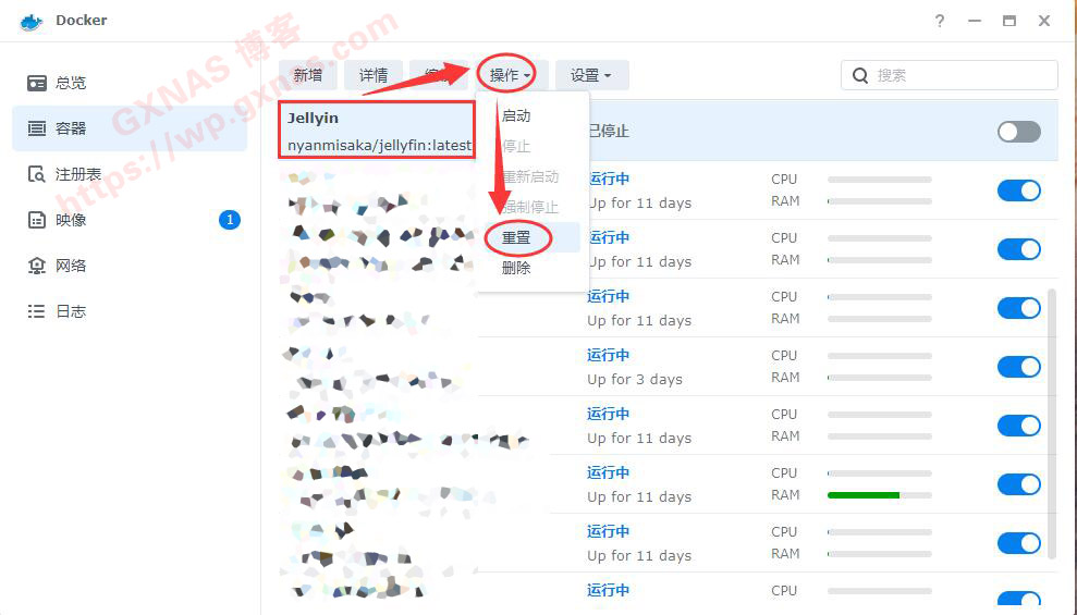 11、在Docker的“容器”菜单,找到刚才已经停止的Jellyfin容器,点“操作”菜单,重置;