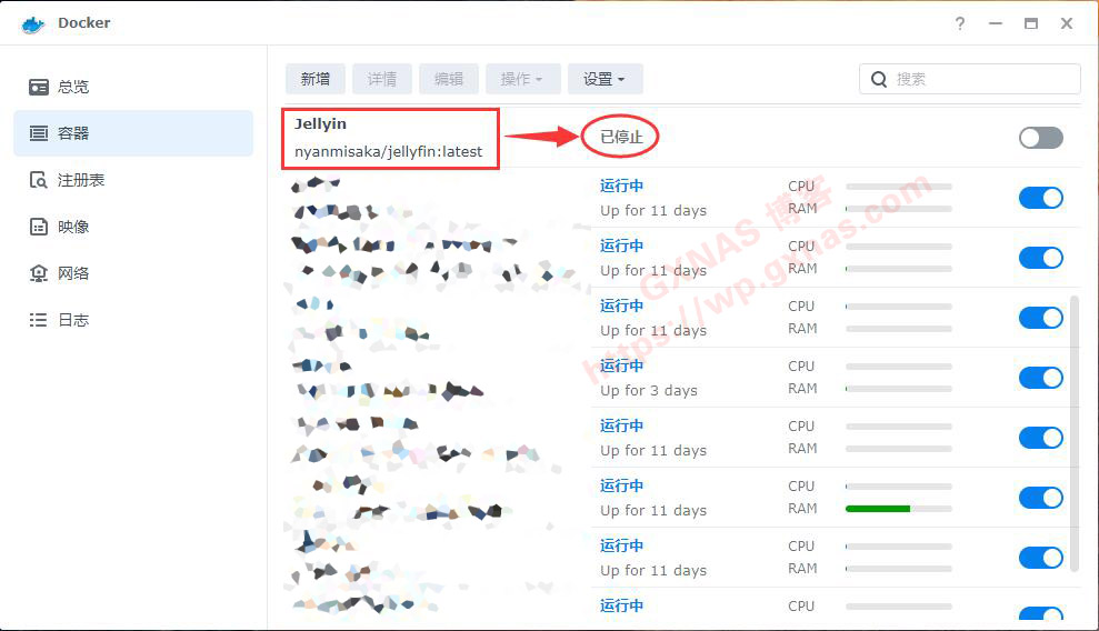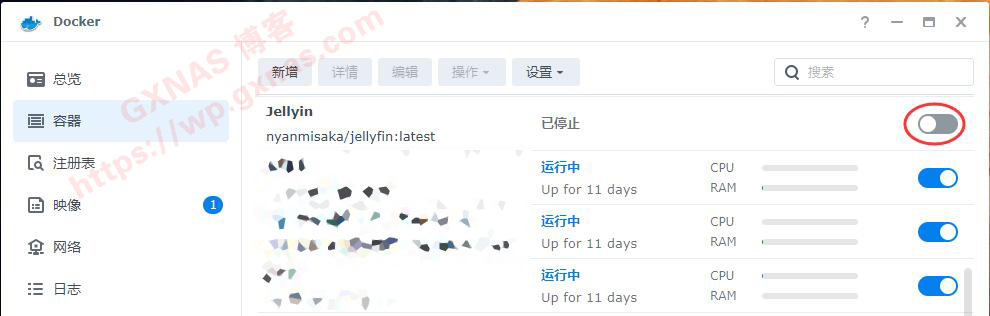 4、回到Docker的“容器”菜单,找到正在运行的“Jellyfin”容器,点最右边的开关;