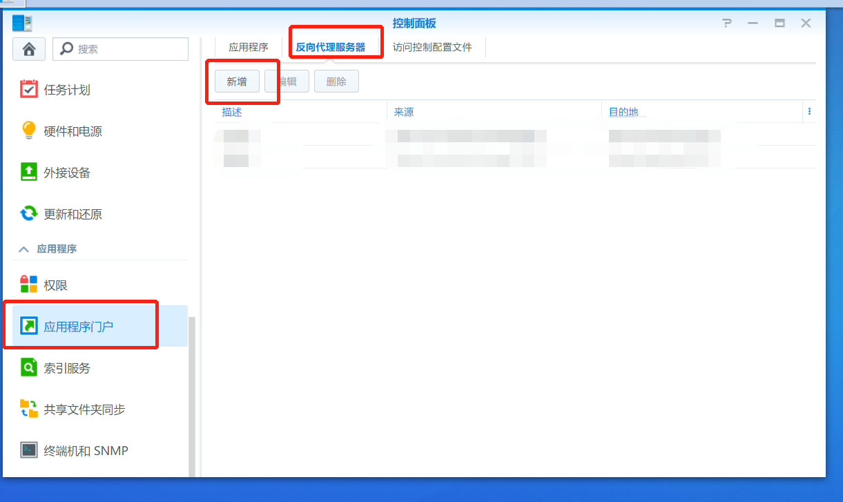 打开控制面板,选择应用程序门户,新增反向代理