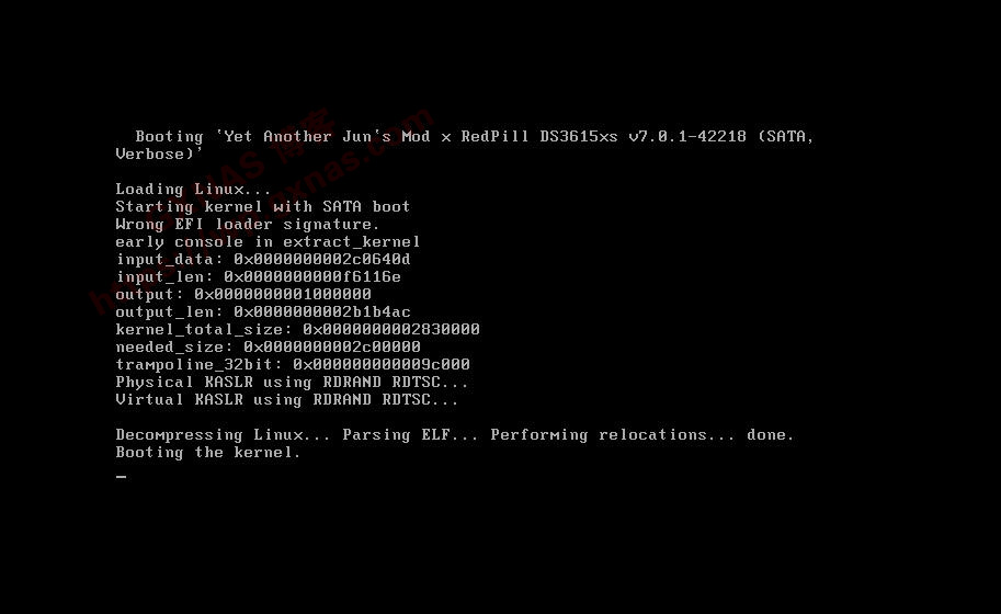博主从DSM5.2的时候开始玩的,截止2024年10月底,DSM系统已经出到了7.22版本,发现黑群DSM系统各种版本的引导启动界面真是五花八门,有很多刚刚入门NAS圈的小白甚至都不知道这些是黑群引导启动的界面,时不时会看到有人问:卡在这个界面了怎么办?那么就来了解一下黑群DSM系统引导启动后都显示什么吧。