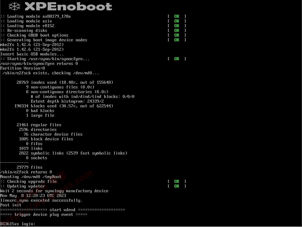 2、DSM1.03b的引导使用uefi方式引导启动后的界面,代表作品有:DS3615xs、DS3617xs、DS916+,该版本的引导支持从6.2-23739到6.2.3-25426up3,但需要注意的是DS3615xs和DS3617xs的DSM1.03b的引导不要使用uefi方式启动,否则启动后会找不到IP;