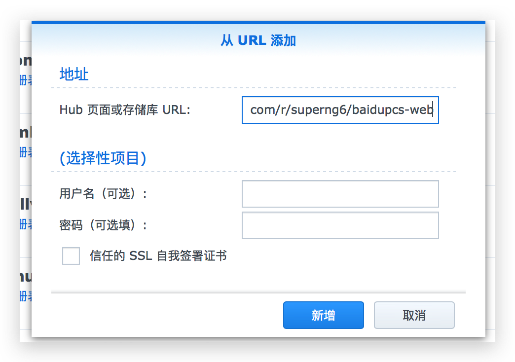 新增镜像,添加链接:https://hub.docker.com/r/superng6/baidupcs-web