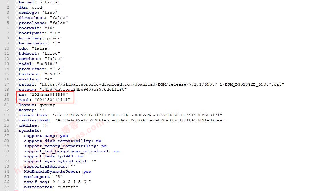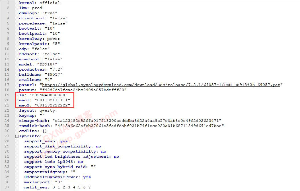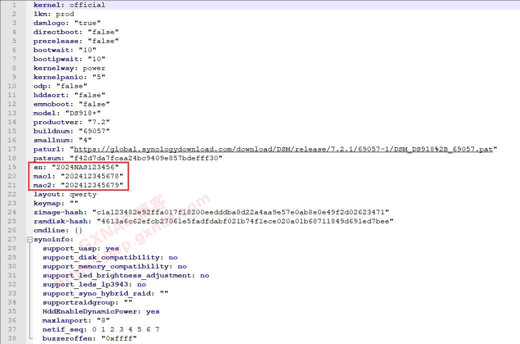 5、假如群晖单网卡的,则删除mac2这行,只保留sn和mac1这两行并根据实际情况进行修改引号里面的内容;
