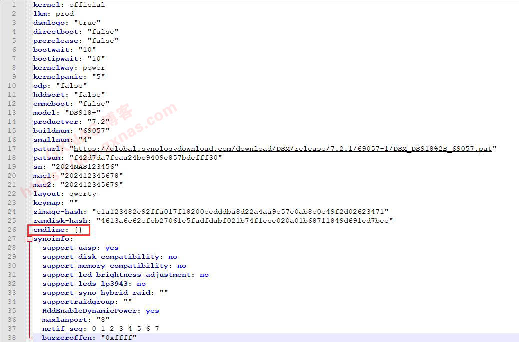 8、如果需要修改硬盘排列顺序(仅非DT机型的才支持修改),引导文件默认不带参数,需要自行添加和修改,找到第26行的cmdline这行;