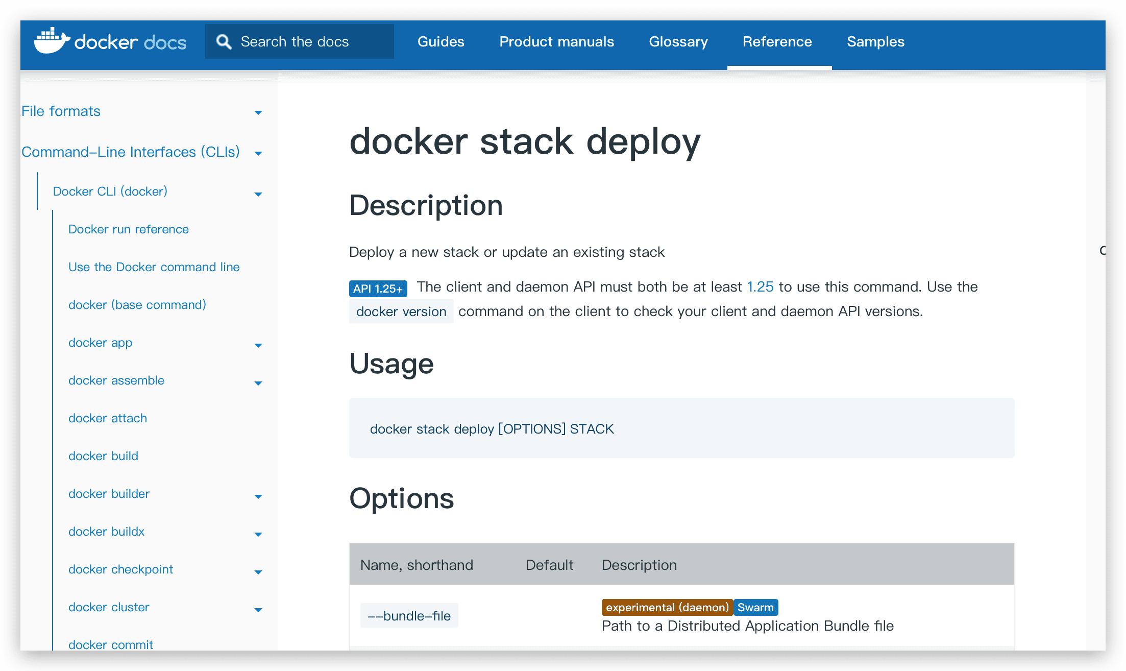 1 2 3 4 5 6 7 8 9 10 11 12 13 14 15 16 17 18 19 20 | root@debian:~# docker stack deploy --helpUsage: docker stack deploy [OPTIONS] STACKDeploy a new stack or update an existing stackAliases: deploy, upOptions: --bundle-file string Path to a Distributed Application Bundle file -c, --compose-file strings Path to a Compose file, or "-" to read from stdin --orchestrator string Orchestrator to use (swarm|kubernetes|all) --prune Prune services that are no longer referenced --resolve-image string Query the registry to resolve image digest and supported platforms ("always"|"changed"|"never") (default "always") --with-registry-auth Send registry authentication details to Swarm agents |