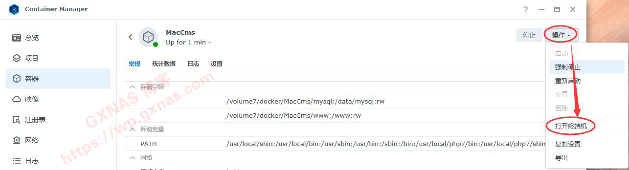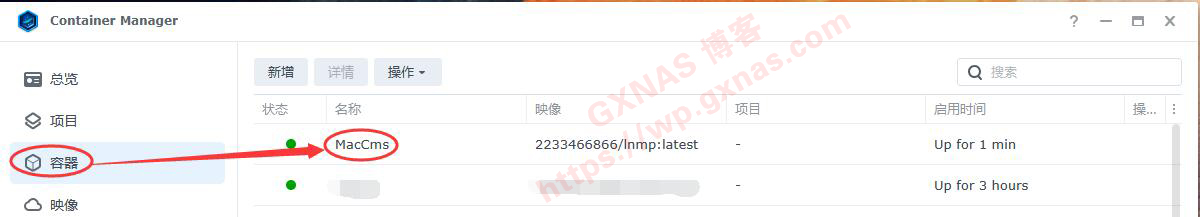 16、在Container Manager(Docker)套件的容器菜单,找到MacCms容器,点击名称进去;