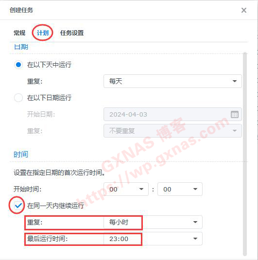 24、在“计划”标签中,根据自己实际需求设置定时启动的时间间隔,本教程设置每小时整点运行;