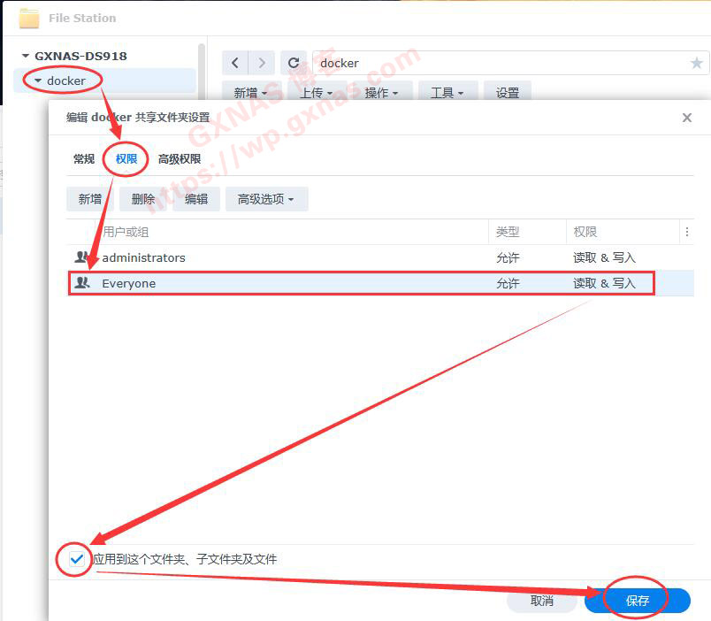 2、请确保docker文件夹已经给予Everyone用户读取和写入的权限,并用应用到这个文件夹及子文件夹;