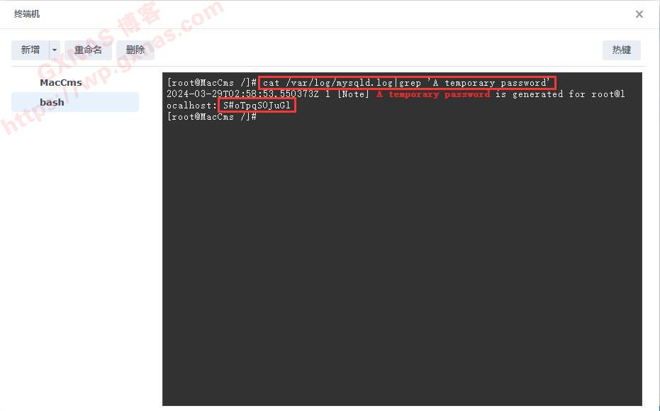 20、输入命令获取mysql数据库的root密码(不要直抄我的,密码由大写字母、小写字母、数字和特殊符号一起随机生成组合密码,以实际生成为准),把密码复制出来;